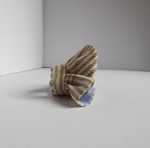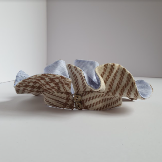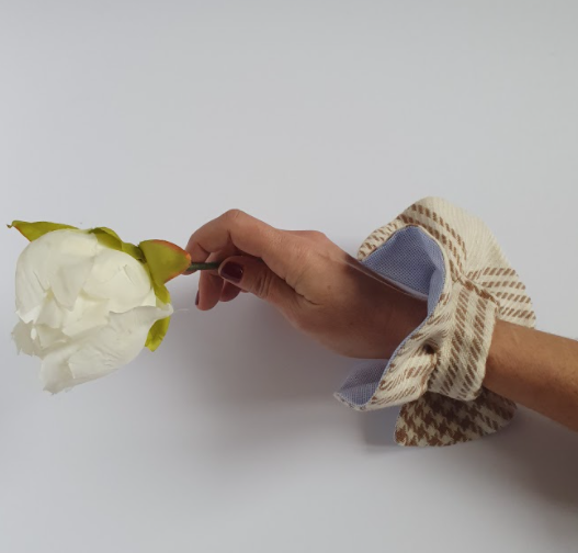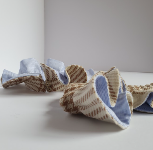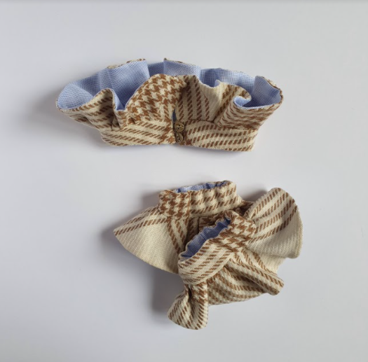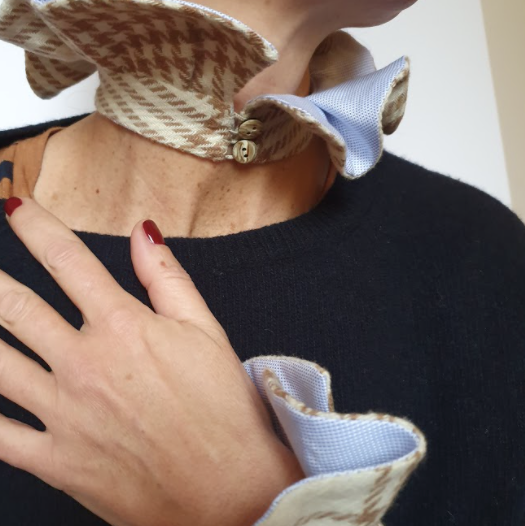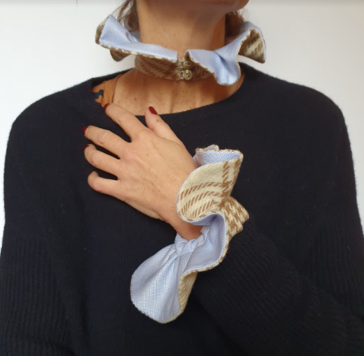 Polsi in lana tartan panna e marrone doppiato in cotone oxford con micro pied de poule bianco e celeste. Chiusura regolabile con elstico. L’effetto decorativo della rouches rimane sobrio e poco invadente. Può essere indossato sopra un maglione o una tshirt, oppure sotto lasciando in evidenza solo la decorazione della rouches. La chiusura può essere sul retro o sul davanti ed il collo, come i polsi della stessa linea, possono essere indossati con arriccio verso l'ato o il basso.